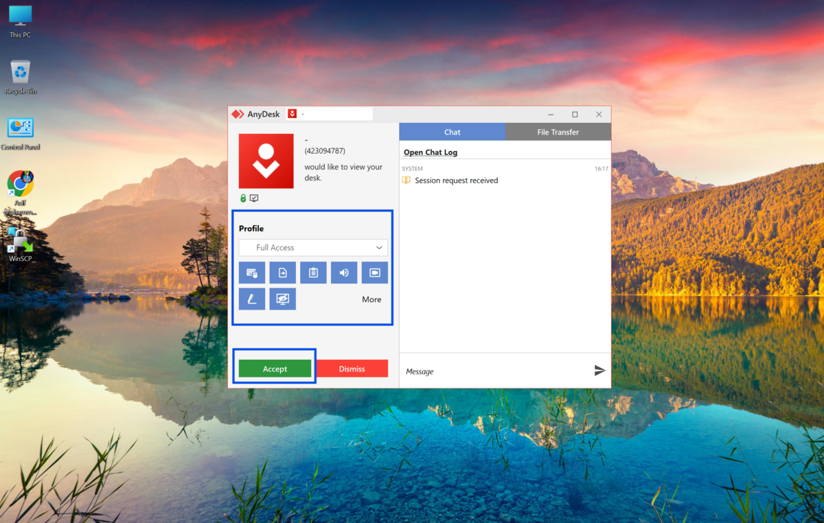The remote computer will show a permission request on screen. If someone is present at the office, they accept it. If you are using unattended access, the connection goes through automatically after you enter the session password.