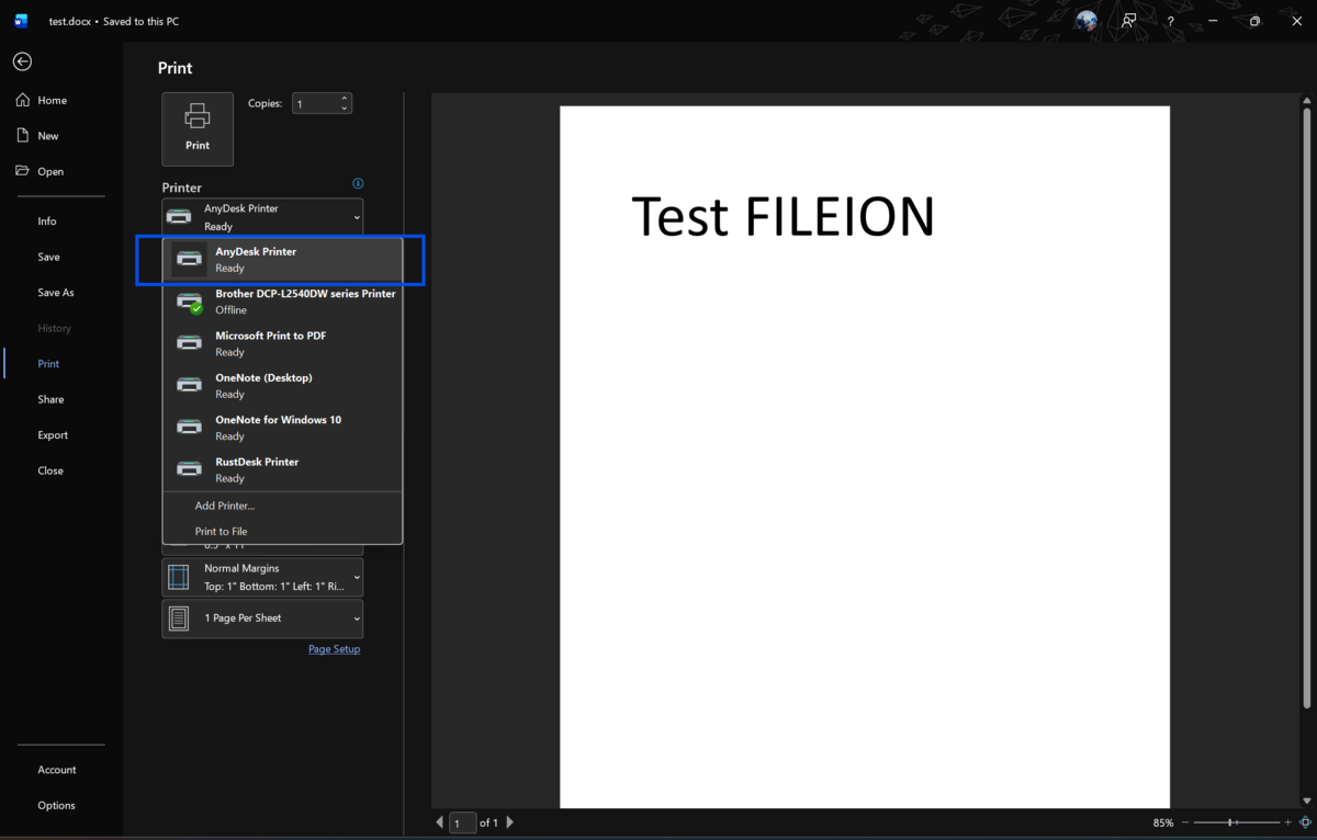 Press Ctrl + P on the remote machine to open the print dialog. Scroll through the printer list and look for an entry labeled "AnyDesk Printer" or your local printer name with a remote tag next to it.